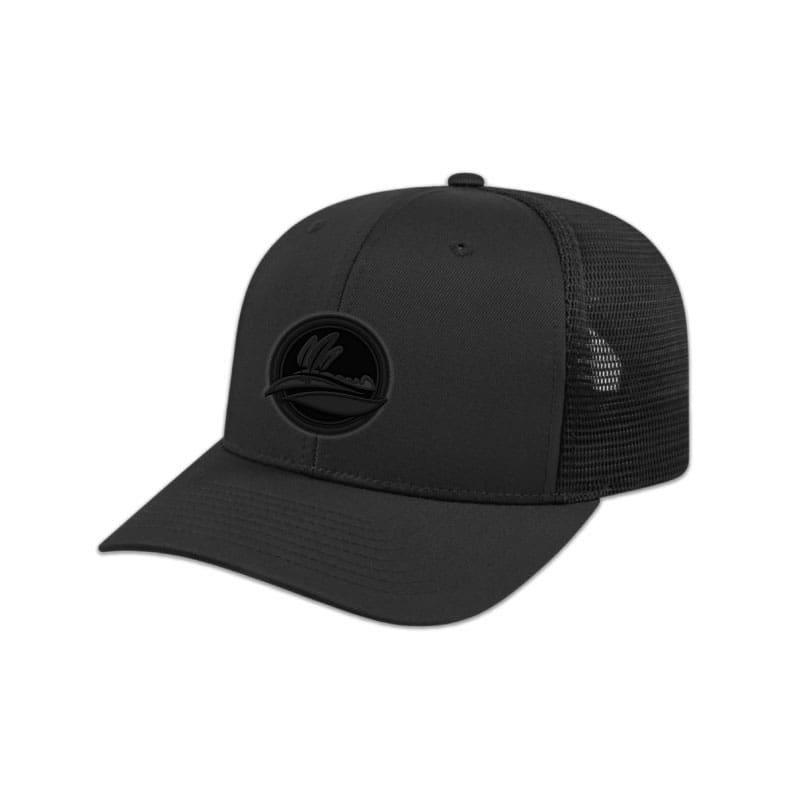 Adult Trucker with Black Front Panel Cap, Black mesh, 35% cotton, 65% polyester; 4″ Crown height; Embroidered; Matching plastic snap; Trucker mesh back; Matching undervisor.
